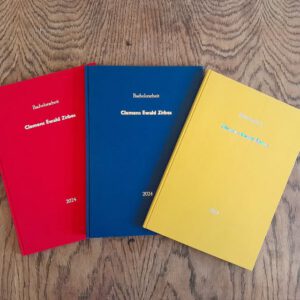 Gebundene Bachelorarbeiten mit Feinleinen, verschiedenen Prägungen und selbstgestaltetem Vorsatz
