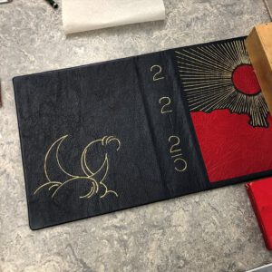 Zudem kann auf dem Buchdeckel in verschiedenen Techniken ein Relief erzeugt werden, um der Fläche haptische Struktur zu geben. Auch Lederintarsien und andere Dekortechniken bieten wir Ihnen an. Mit einer individuellen Prägung wird Ihr Produkt unverwechselbar.